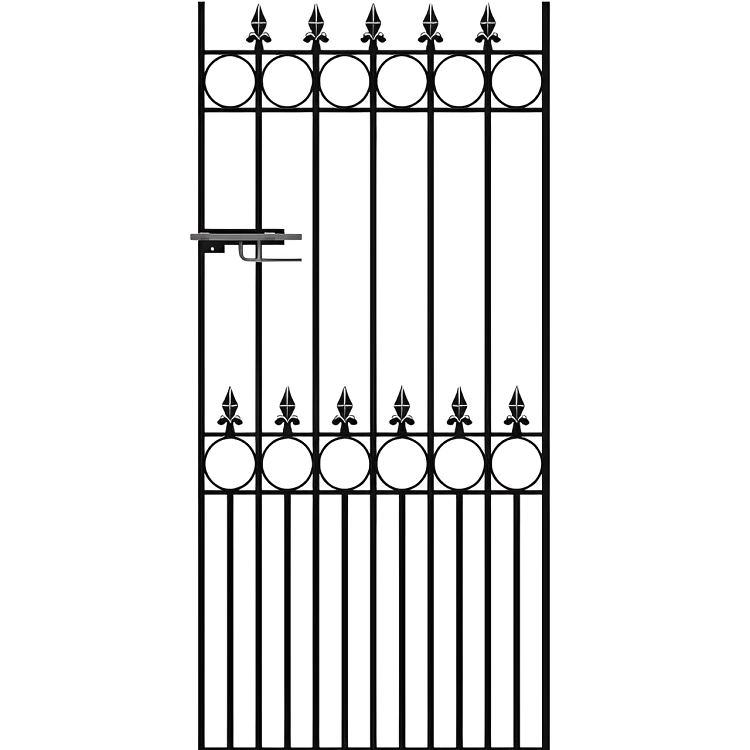 Please allow approximately 6 weeks lead time for delivery of this product.{"master_inherit":"1","ignore_master_inherit_settings":{"171":"0"},"master_id":"171"}The Royale Talisman Wrought Iron Style Side Gate is a stunning and exceptionally durable barrier that combines elegance and security effortlessly. Manufactured in the UK to a high standard, this gate is the ideal choice for homeowners needing to deter intruders and unwanted guests while enhancing the aesthetic appeal of their property. Constructed from heavy-duty solid steel components, the Royale Talisman features a robust 40mm x 30mm flat bar hanging stile, a 40mm x 10mm closing stile, and 16mm round infill bars, ensuring unparalleled strength and longevity. The striking design is elevated by a double row of fleur-de-lys finials and elegant wrought iron-style circles, adding timeless appeal to any entrance. Ideal for many types of architecture, including residential properties, period homes and country cottages, the gate also incorporates closely spaced dog bars in the bottom section, making it a sensible choice for households with pets and small children.