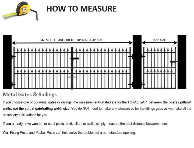 Ordering Sizes Made Easy: The “Fits Opening” measurement shows the space needed between your posts or brickwork. Each gate is made slightly narrower to allow for hinge and latch clearance. For further information, please refer to the "Ordering Sizes" section in the description below.